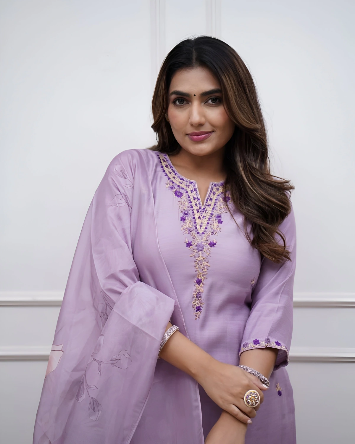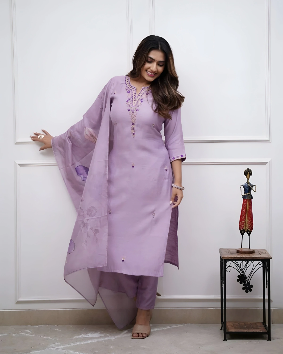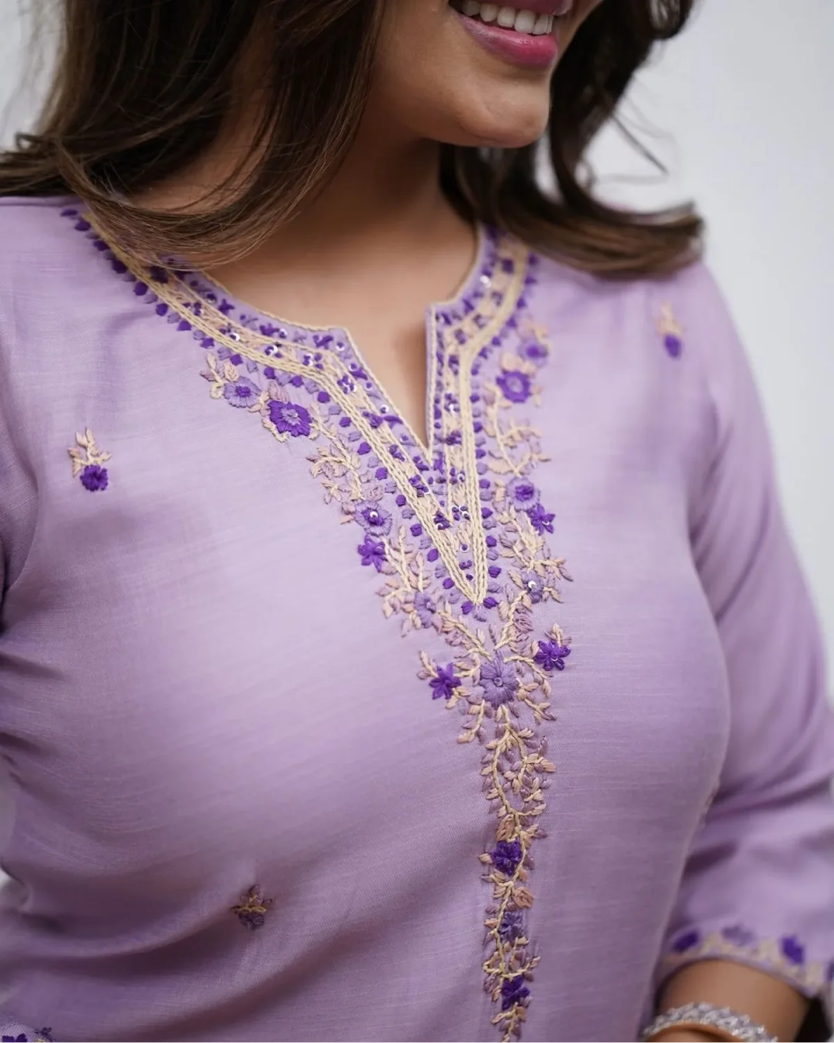 Elegant Rayon Suit Set with Hand Embroidery and Zari Work