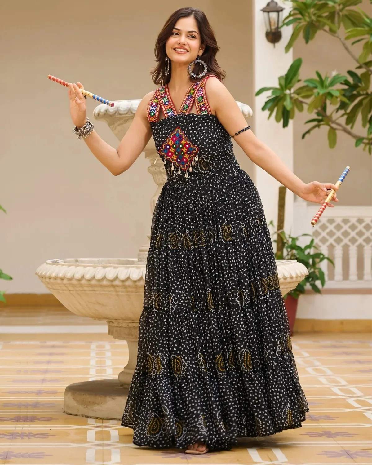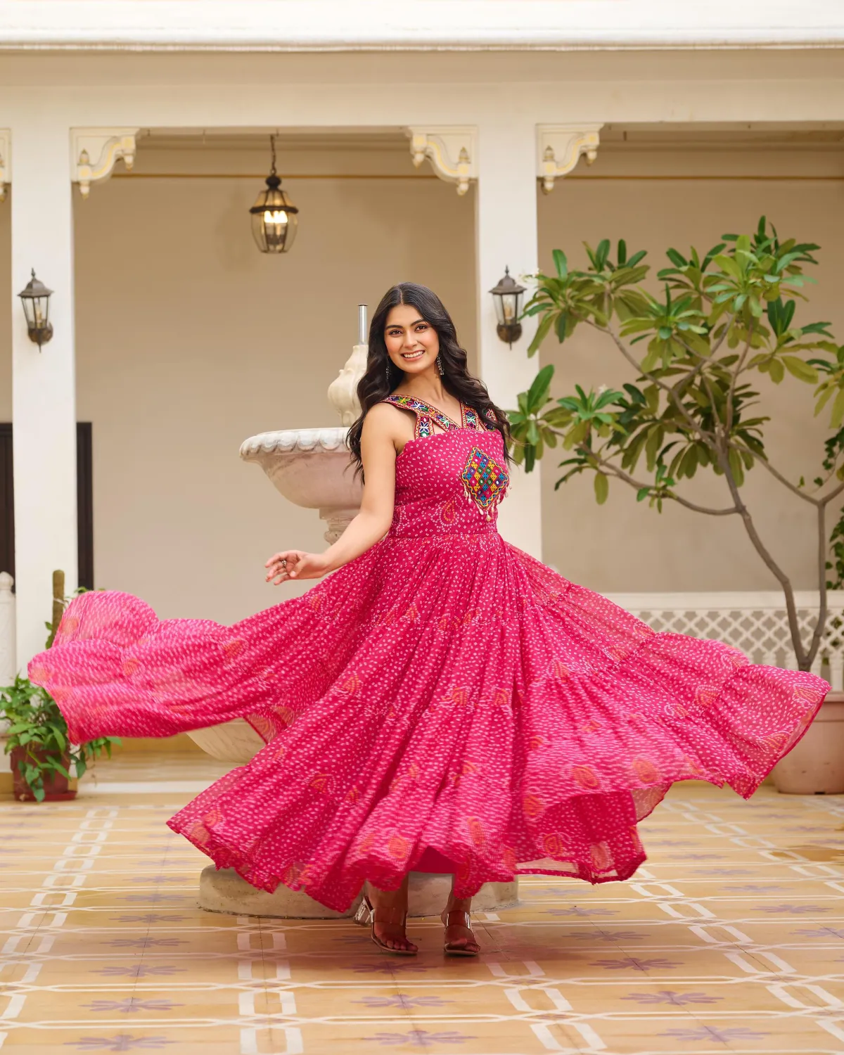 Step into the festive spirit with this stunning Georgette Bandhani Gown with Gamathi & Mirror Work, designed to radiate elegance and tradition this Navratri.