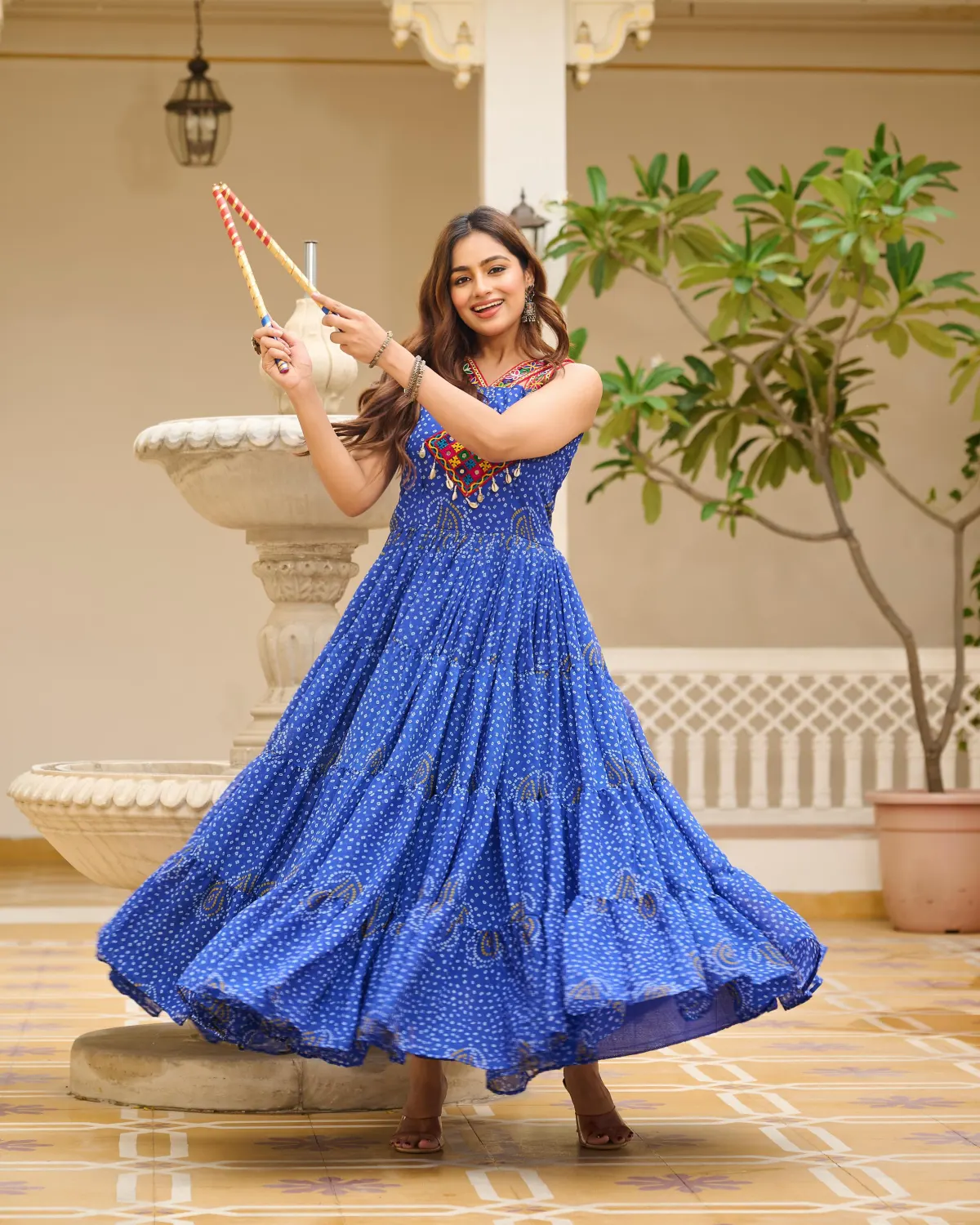 This gown beautifully blends vibrant Bandhani prints, authentic Gamathi embroidery, and mirror work with a luxurious 12-meter flair – making it the perfect choice for Navratri nights and festive celebrations.