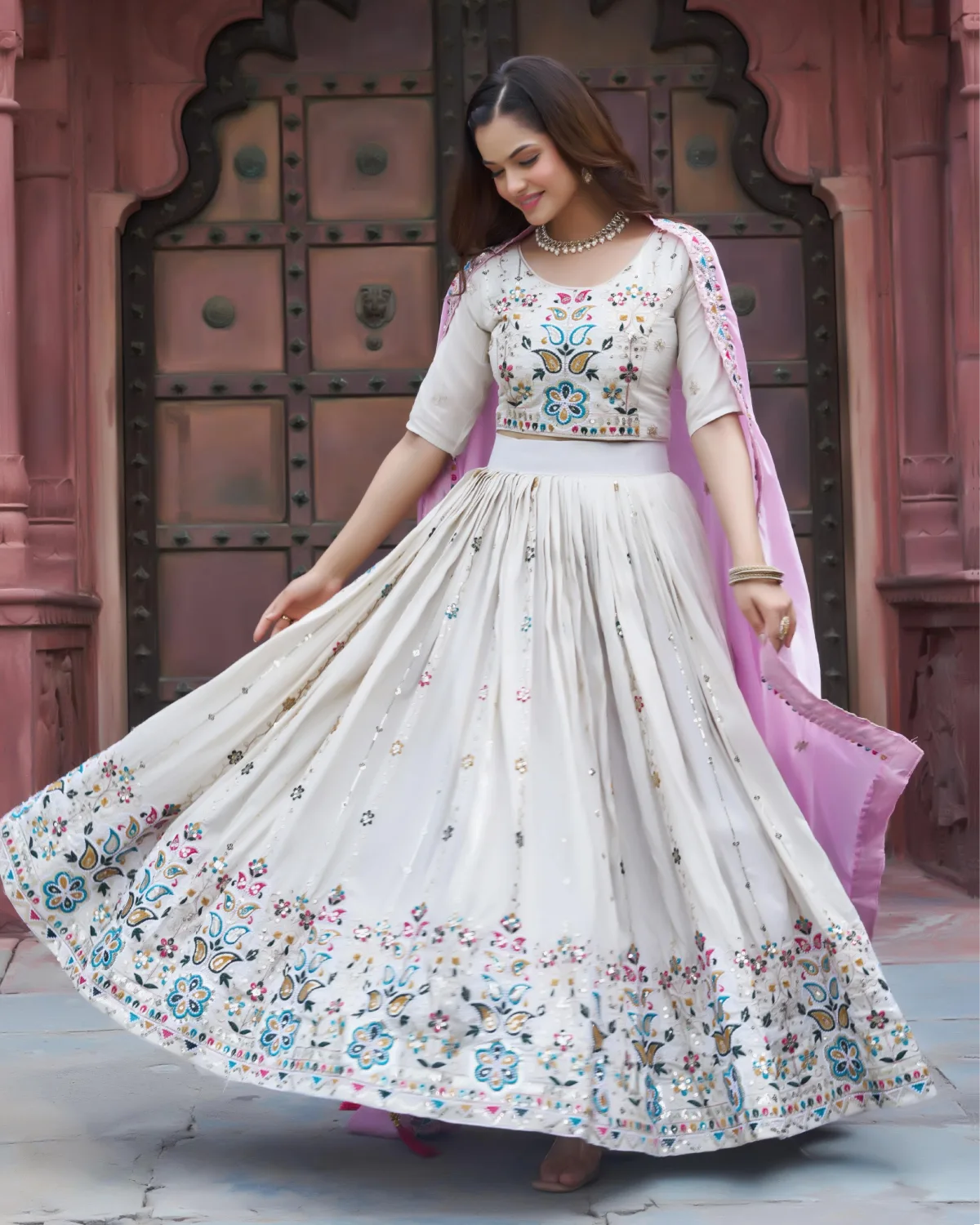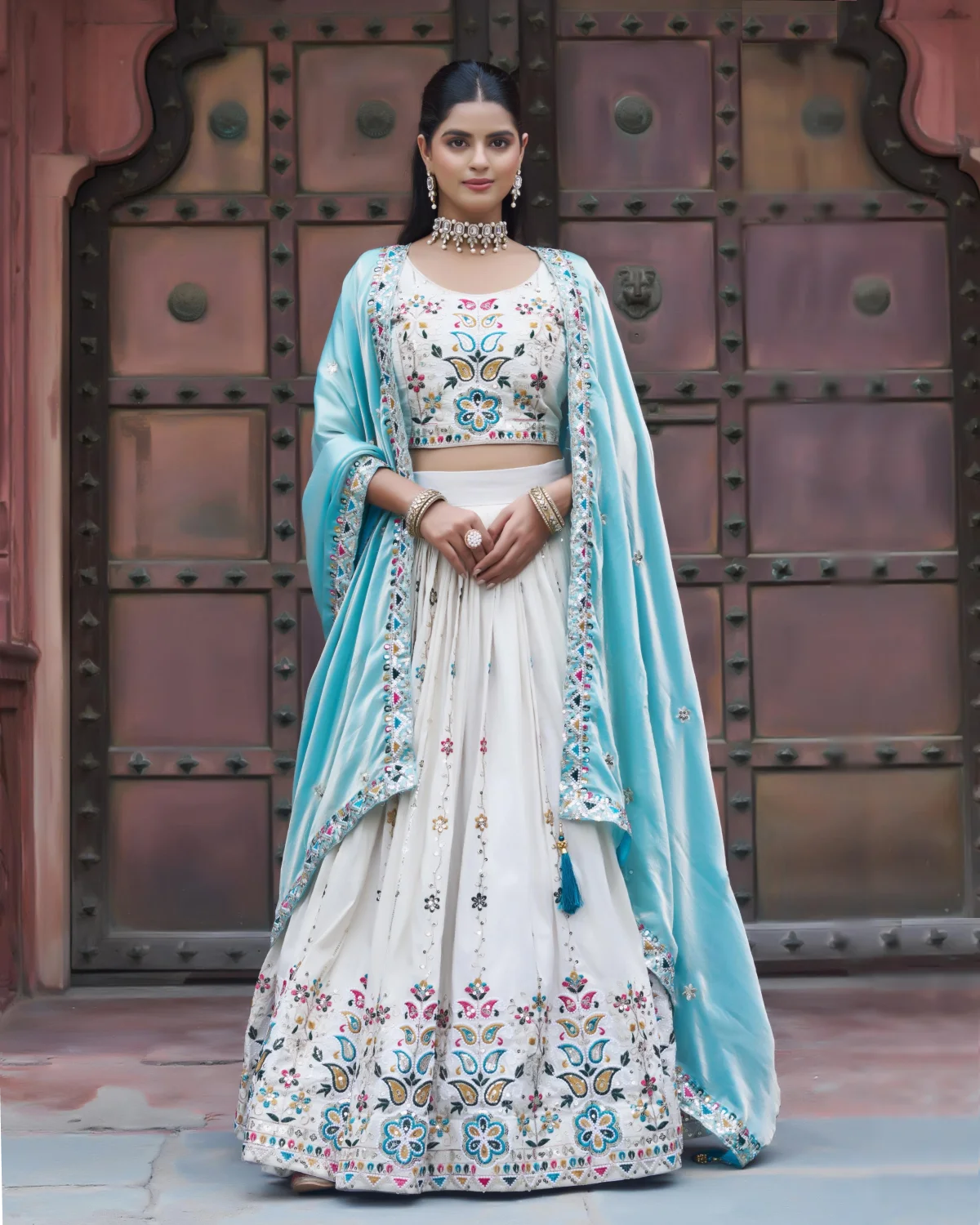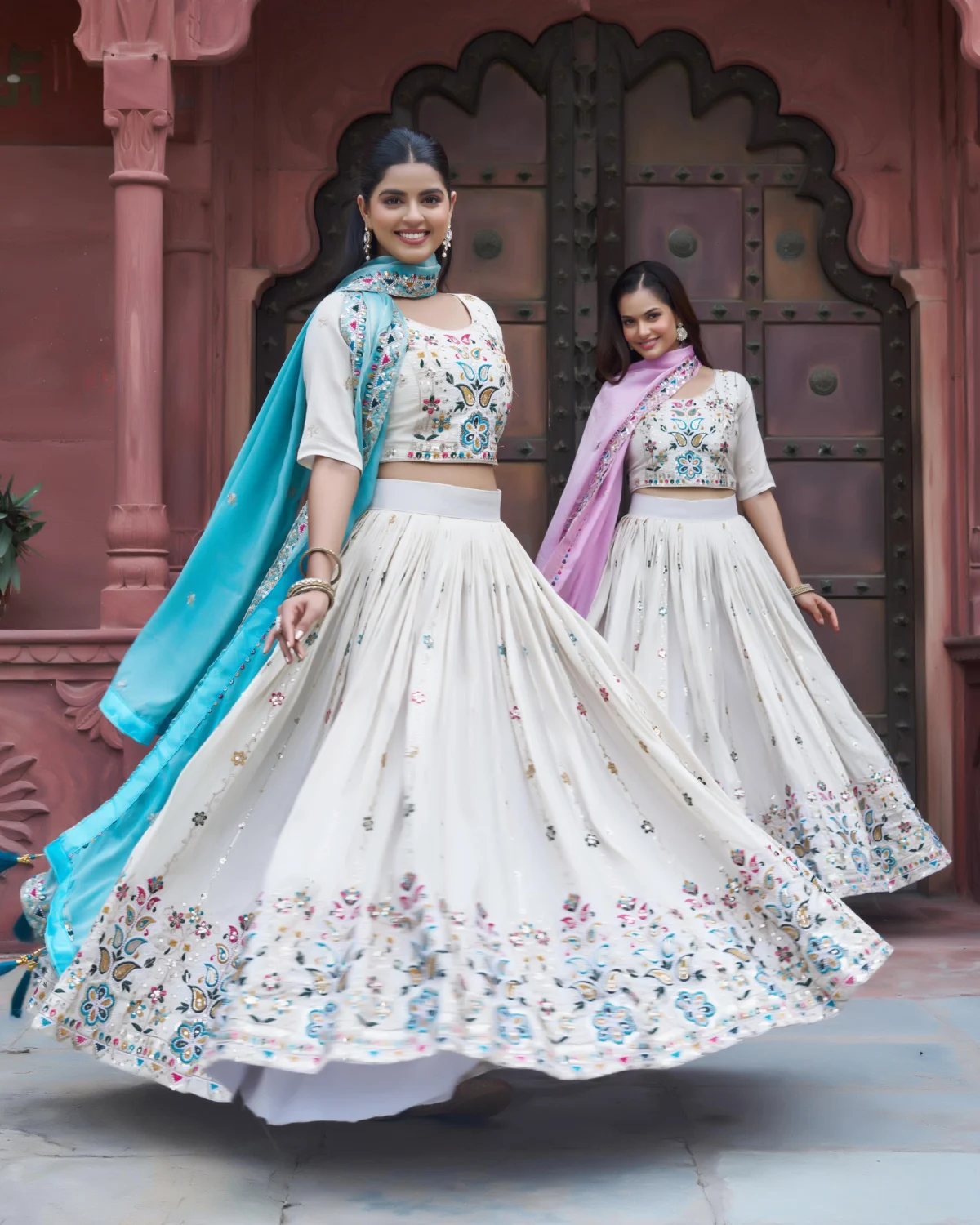 Embrace timeless elegance with this Off-White Georgette Lehenga Choli Set, beautifully detailed with mirror and thread work. Designed to make you glow with sophistication at any festive or wedding celebration.