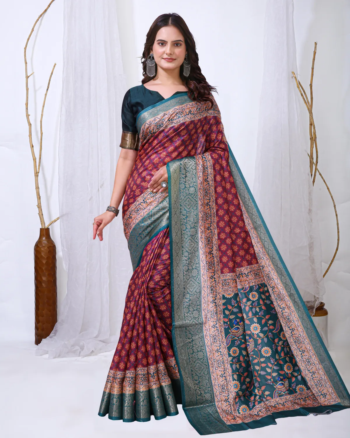 - Work: Digital Print with Zari Jacquard Border & Pallu